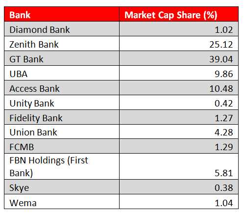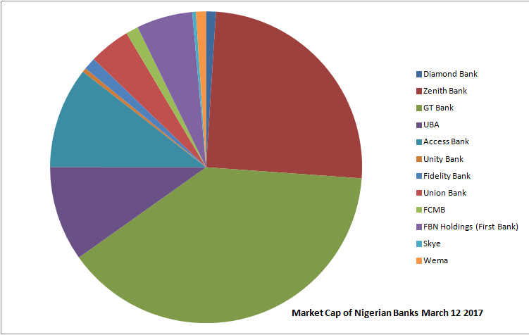 Most banks in Nigeria are seriously under-capitalized. GTBank and Zenith Bank account for more than 64% of the total market capitalization of the banking sector. (We have excluded ETI (Ecobank Trans) in this analysis since it is not really wholly Nigerian.) This presents these banks as clear leaders. Diamond Bank, Unity Bank, Skype and many others are rounding numbers. In short, GTBank can buy all the banks in Nigeria (with shares) with the exclusion of Zenith Bank. Government may have to think how to strengthen the sector as it is obvious that some cannot survive in an era of fintech which has brought erosion of bank fees.