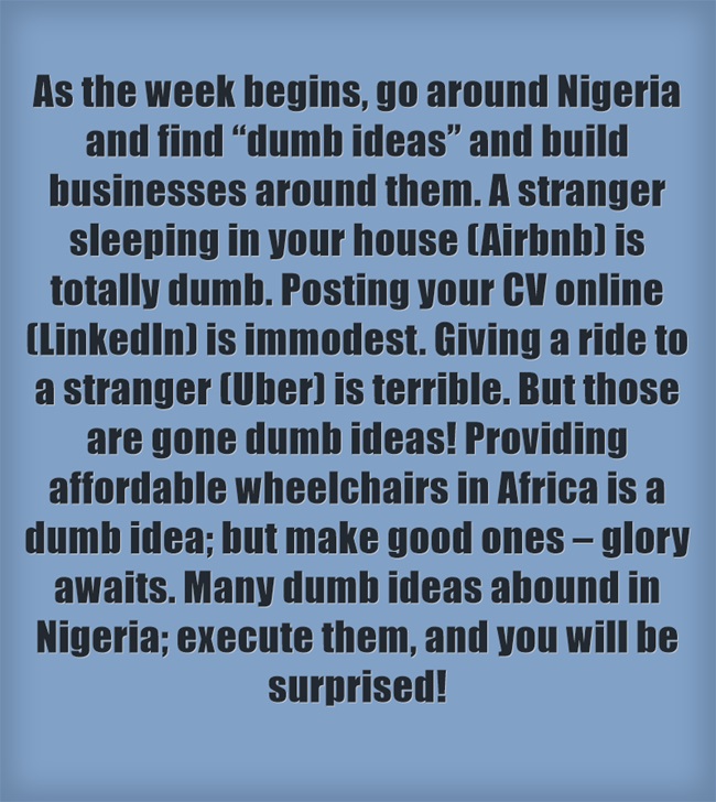 As the week begins, go around Nigeria and find “dumb ideas” and build businesses around them. A stranger sleeping in your house (Airbnb) is totally dumb. Posting your CV online (LinkedIn) is immodest. Giving a ride to a stranger (Uber) is terrible. But those are gone dumb ideas! Providing affordable wheelchairs in Africa is a dumb idea; but make good ones – glory awaits. Many dumb ideas abound in Nigeria; execute them, and you will be surprised!