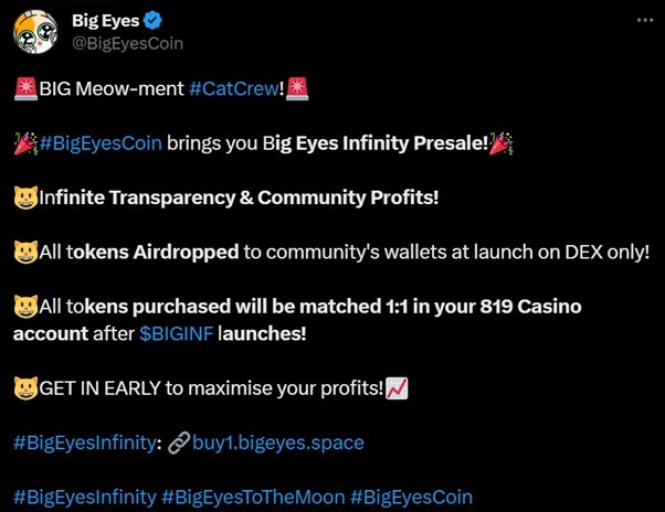 Crafting a more transparent ecosystem, the utility token, Big Eyes Infinity, gears up for an airdrop launch that will distribute its entire token supply to its supporters: both $BIGINF and $BIG token holders. This innovative approach sidesteps the complexities of traditional claiming processes by directly distributing the tokens through a decentralized exchange (DEX).