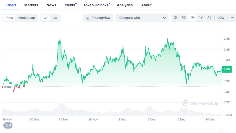 Meme currency pioneer Dogecoin has always surprised the crypto world. DOGE is still strong at $0.40 after surging 10%+ in the past month. DOGE price has been propelled upward due to whale activity and growing adoption as a method of payment. Dogecoin could repeat its historic 2021 bull run, many investors believe.