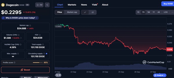 At the time of writing, Dogecoin trades around $0.22 to $0.24, according to market data from BanklessTimes. It has lost nearly 19% over the past week yet remains up over 100% compared to the same period last year. Analysts from CoinCodex expect DOGE to range between $0.2576 and $0.2924 by late 2025, while some optimistic forecasters envision a path to $0.30 if the market turns bullish.