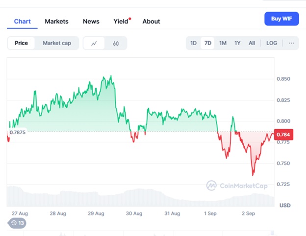 Cryptocurrency enthusiasts often find themselves pondering the potential of emerging tokens. Dogwifhat (WIF), a meme coin riding the coattails of Solana’s ecosystem, has garnered attention for its playful branding and community-driven appeal. Currently priced at $0.7851 with a 24-hour trading volume of approximately $158 million, WIF’s market performance has been a topic of discussion among analysts and investors alike.