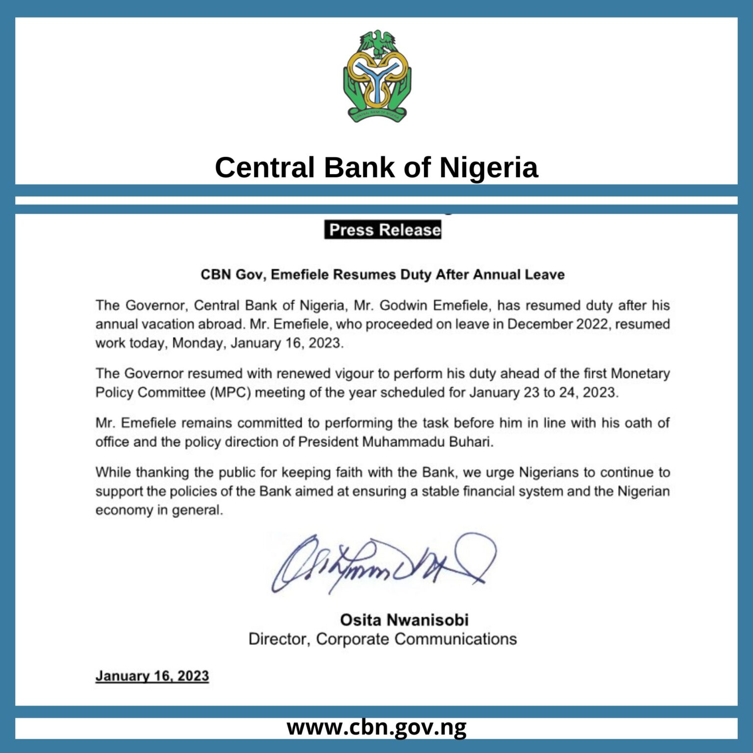 Although there are claims that his disappearance has nothing to do with DSS’ attempt to arrest him, that he’s on his annual leave, Emefiele is due to return to Nigeria to resume work as the head of the Central Bank of Nigeria (CBN). But that has not happened.
