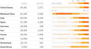 The number of known coronavirus cases in the United States continues to grow quickly. As of Thursday morning, there have been at least 85,381 cases of coronavirus confirmed by lab tests and 1,271 deaths, according to a New York Times database.
