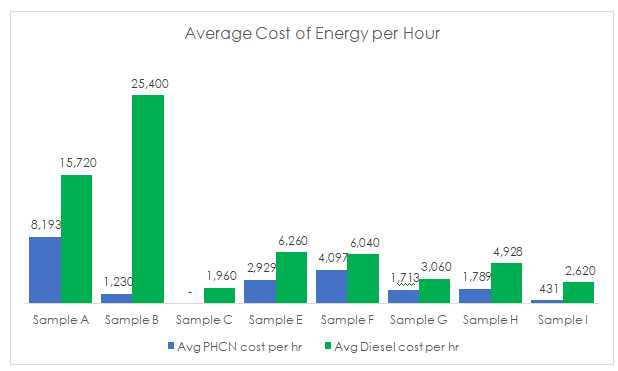 Average energy cost index above show that sample site like Sample C, Sample B, Sample I, Sample H located at Ikoyi West, Ikoyi South West have lower PHCN supply hours under the period in review as compared with their diesel consumption. Thus, areas with a lower PHCN indicate lower supply of power by EkoDisco to this location as compared with Sample F in the quarter under-review.
