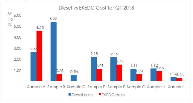 The above chart represents the cost difference across sample sites, Sample B and Sample A have the highest accrued Diesel cost respectively, Sample A has the highest EKEDC cost and Sample C has the lowest energy consumption cost overall with N334,050.00 & N255,079.65 for Diesel and EKEDC respectively. Average energy cost across all the site under-review is for this quarter is ? 1,008,490.80.