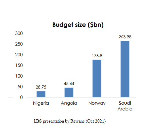 But in summary, I relied on the Oct 2021 Lagos Business School presentation by Nigeria’s smartest financial analyst, Bismarck Rewane, CEO of Financial Derivatives Company Ltd. On page 25 of that presentation, he has this plot on the left. He is certainly a smarter man than yours truly that anything he puts out there must be correct. In short, he put the budget of Nigeria at $28.75 billion when I was gracious to put it at $35 billion. He is certainly right considering that our budget execution is never 100%.