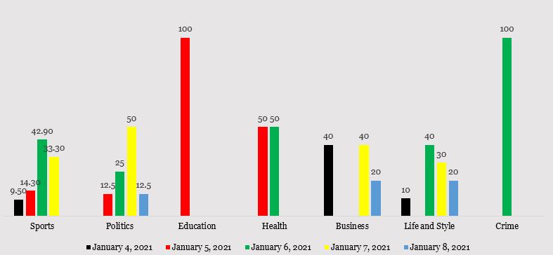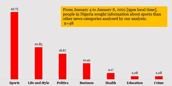 From January 4 to January 8, 2021, people in Nigeria searched sports, life and style related information or news more than other categories, our analysis reveals. On the first day [January 4, 2021], the match between Southampton and Liverpool was considered most important, followed by the news that Jack Ma’s, whereabout was not known for two months. Other three information/news were on business, life and style and sports [football]. On January 5, 2021, English Premier League matches were searched mostly including Georgia runoff election in the United States of America, denial of breach of agreement with the Academic Staff Union of Universities in Nigeria by the Federal Government. During the day, people also developed interest in knowing UK lockdown due to a second wave of COVID-19. Nigerians and other nationals ended the day with the interest in understanding FA Cup matches.