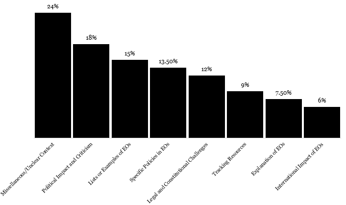 Explanation of Executive Orders. Our analysis shows a notable segment of tweets that focused on explaining what executive orders are, their purpose, and their limitations. According to our analyst, this indicates the place of X through the users in educating the public about the US Executive Orders, demonstrating an ongoing need for civic education, as many people remain unclear about the legal foundation and boundaries of EOs. For the world, this stresses the critical role of transparency in governance and the necessity of ensuring citizens understand the tools wielded by their leaders.