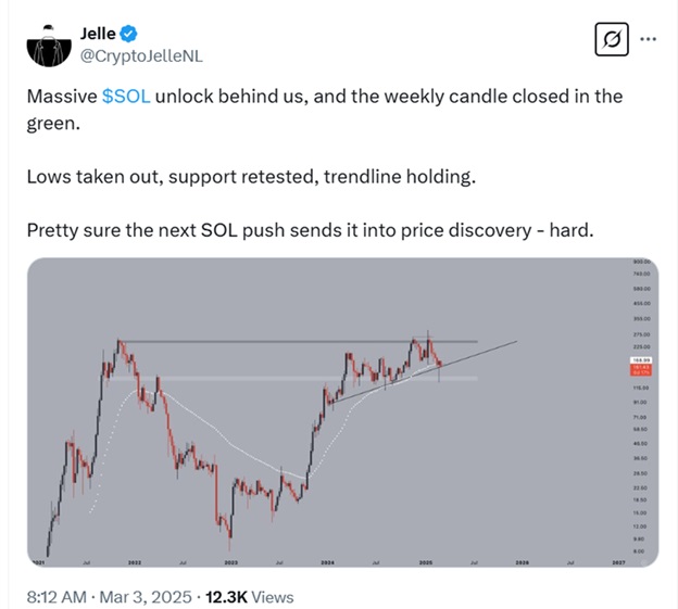 However, the community is still watching this token thanks to a recent bullish Solana price prediction. Recently, market expert Jelle made an X post saying that this altcoin saw a weekly candle closing in the green while holding its trendline. Thus, he foresees a potential pump to $225 in his Solana price prediction.