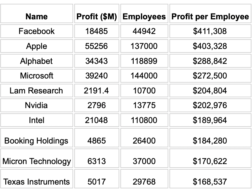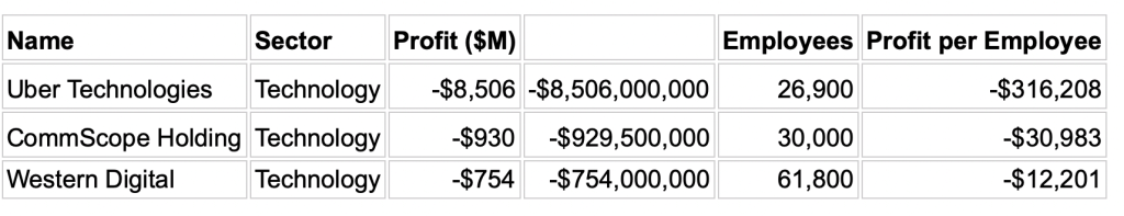 Financial tech firm Tipalti crunched numbers from the Fortune 500 list to figure out how much profit tech companies are making per employee. The results put Facebook, Apple, Alphabet and Microsoft at the top. Facebook’s profit per employee is $411,308 and Apple’s $403,328. Uber, meanwhile, is losing a whopping $316,208 per employee.