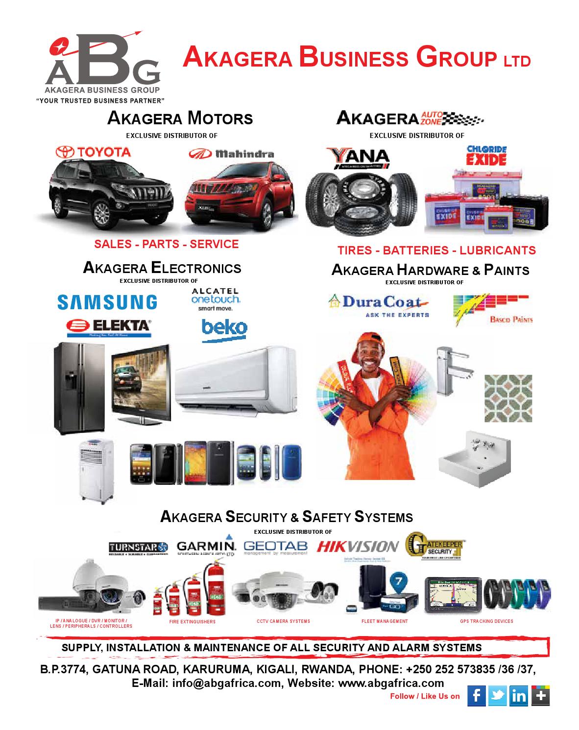 Akagera Business Group (ABG) was established in Kigali, Rwanda and diversified into nine different divisions dealing in automobiles, tires, batteries, lubricants, media, consumer goods, consumer electronics, car rentals, hardware, paints, design, construction, security and safety systems. Akagera’s nine divisions cut across Motors (since 1997); Hardware & Paints (2006); Auto Zone, Trading, and Media (all established in 2008); Car Rentals, and Electronics (both established in 2010); Design & Construction (2012); and Security & Safety Systems which was established in 2014.