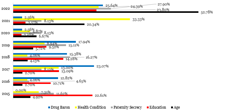 Given the significant controversies that have surrounded the candidate and his party since 2015, our analyst observes that the use has become crucial for them. Our data demonstrate that, between 2015 and 2022, the spread significantly increased the digital public’s interest in knowing his age (n=629) and health status (n=123), as opposed to his paternity (n=86), education (n=84), and perception of him as “a drug baron” (n=39). The ages of many people have been used as a basis for figuring out his age. In 2022, his daughter Folashade Ojo, along with Senator Oluremi Tinubu, his wife, and the age of former vice president Atiku Abubakar, have been primarily used to determine his proper age.