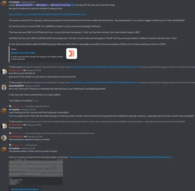 A blockchain sleuth in the official Harmony One discord, confirmed that the newly hired Developer at Harmony One has fallen victim to a malicious phishing contract and his wallet has been drained of $3000 in Ether’s value so far, same story triggered the $100m hack in June 2022.