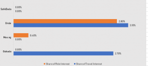 During the period, public interest in travelling and taking rides resonated with Gokada by 8.7%, Oride by 27.8% and SafeBoda by 1.7%. It was a reduction for Max.ng. We discovered a 9.8% reduction in the provider when the public interest in travelling and taking rides was at 1%.