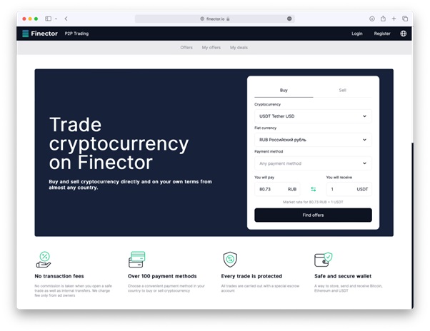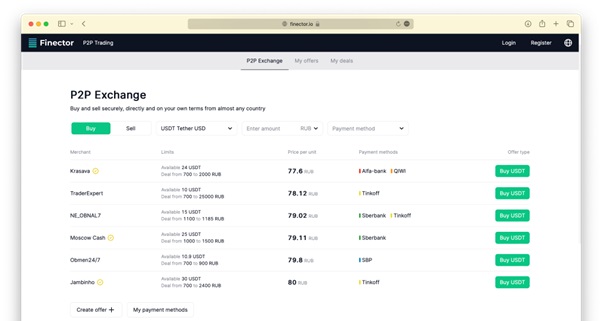 Finector provides a platform for secure transactions between buyers and sellers (merchants) – offers to sell cryptocurrency on the platform are posted by other users.