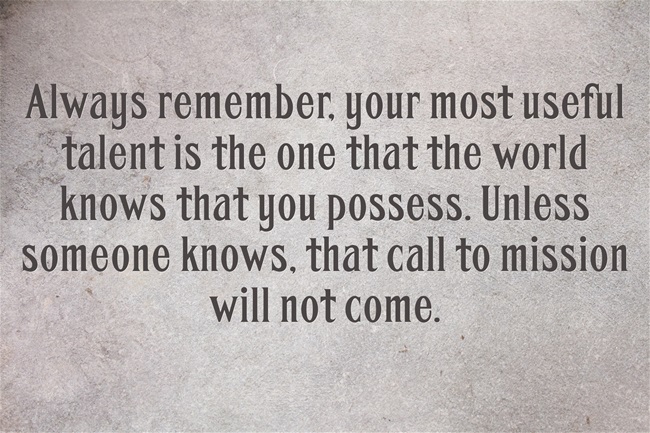 Always remember, your most useful talent is the one that the world knows that you possess. Unless someone knows, that call to mission will not come.