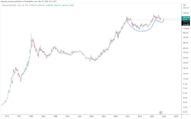Accompanying charts underscored gold’s potential to repeat its 70s behavior, among which were a “cup and handle” chart structure playing out since 2010.
