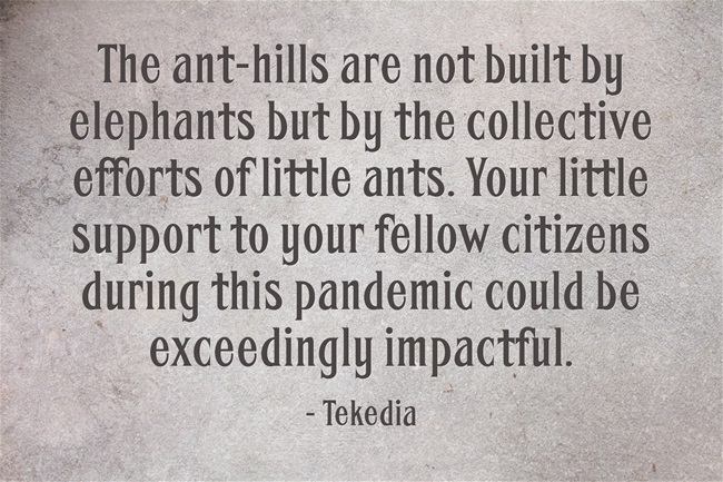 The ant-hills are not built by elephants but by the collective efforts of little ants. Your little support to your fellow citizens during this pandemic could be exceedingly impactful.