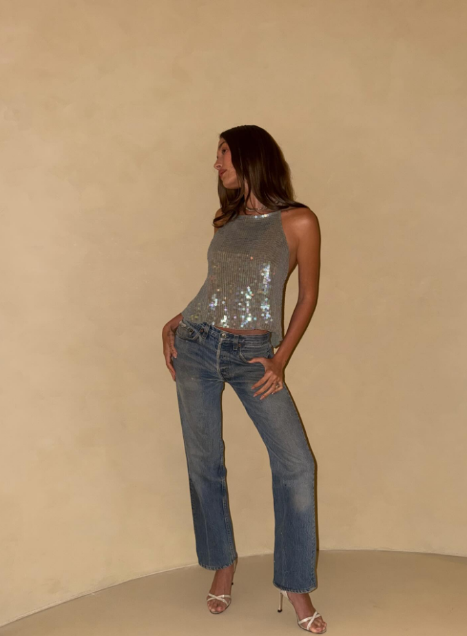 The birthday girl looked stunning in blue jeans and a halter top that resembled a disco ball for the event.