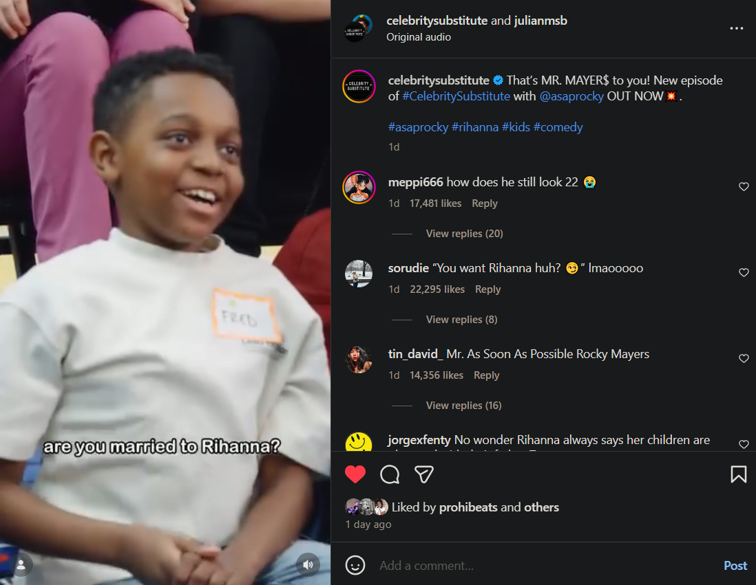 During his appearance on Celebrity Substitute on February 4, A$AP told the child, "That's an interesting question that you asked," before asking if he would prefer to have the founder of Fenty Beauty serve as his teacher for the day. “You want Rihanna, huh? Well, you got me. You got me today.”