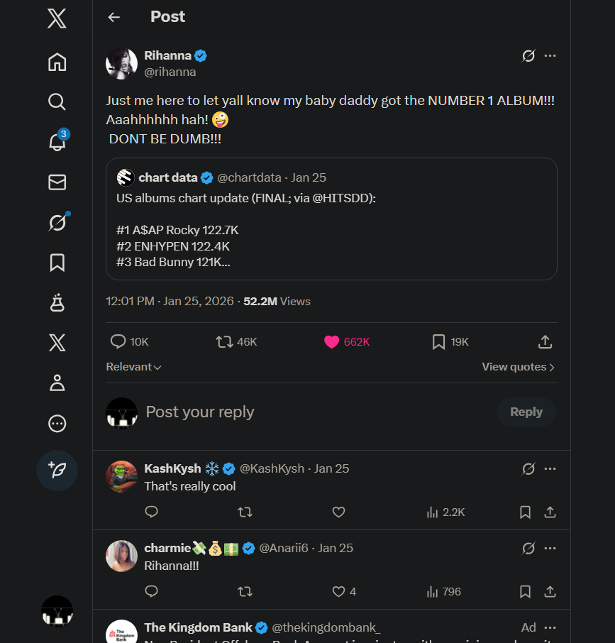 “Just me here to let y'all know my baby daddy got the NUMBER 1 ALBUM!!!” she posted on X January 25. “Aaahhhhhh hah! DONT BE DUMB!!!”