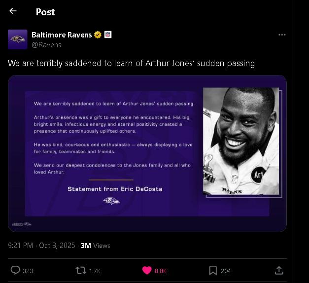 A tragic loss has left the football community in mourning. Arthur Jones passed away on October 3. He was a defensive lineman with the Baltimore Ravens from 2010 to 2013 and helped the team win Super Bowl XLVII in 2012. His age was 39.