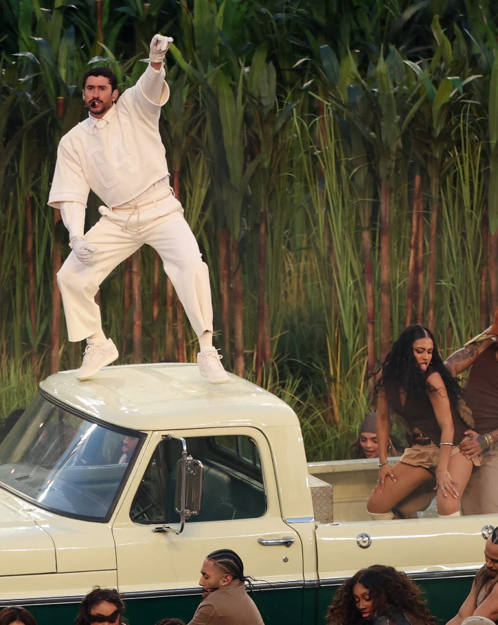 In addition to performing his songs "Monaco," "Baile Inolvidable," "Nuevayol," and others during his 13-minute show inside Levi's Stadium, Bad Bunny paid tribute to the island by walking through sets that featured sugar canes, village homes, elderly men playing dominoes, people eating piragua treats, and a reference to the last Puerto Rican social club in New York.