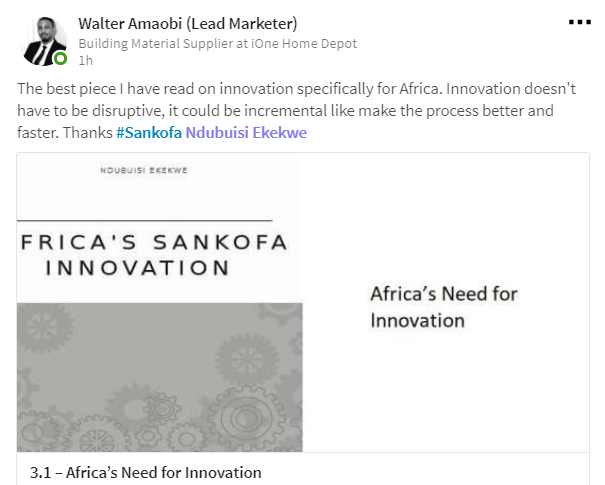 Thanks Walter Amaobi (Lead Marketer) for the kind comments on my new book - Africa's Sankofa Innovation.