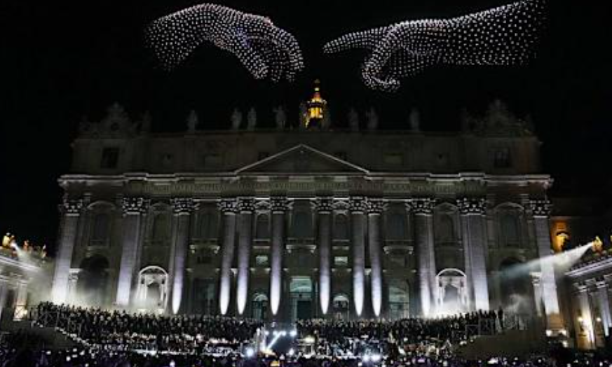 As the concert concluded, the audience turned its gaze upward to witness a revolutionary drone show over the dome of St. Peter's Basilica. More than 3,000 drones, operated by Nova Sky Stories—a company owned by Kimbal Musk, brother of Elon Musk—formed intricate images in the night sky.