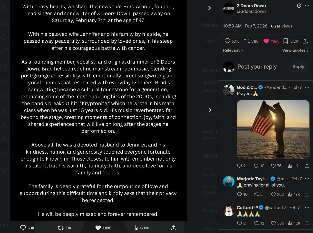 Brad Arnold, lead singer of 3 Doors Down, passed away on February 7 at the age of 47 after a battle with cancer.
