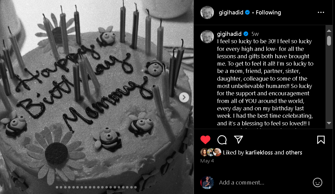 "I feel so lucky to be 30!" Hadid wrote in addition to pictures from her birthday celebration that were uploaded to Instagram last month, one of which showed her and the 50-year-old kissing passionately. "I feel so lucky for every high and low—for all the lessons and gifts both have brought me. To get to feel it all! I’m so lucky to be a mom, friend, partner, sister, daughter, colleague to some of the most unbelievable humans!!"