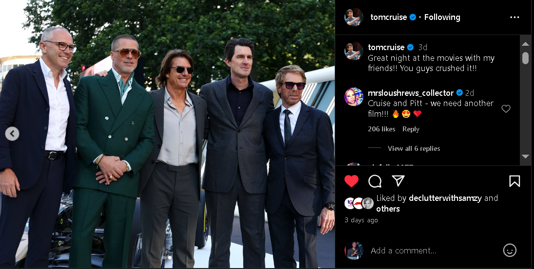 At the London event, Pitt reconnected with Tom Cruise, his former costar from Interview With the Vampire, who had previously collaborated on Top Gun: Maverick with F1 director Joseph Kosinski and producer Jerry Bruckheimer.