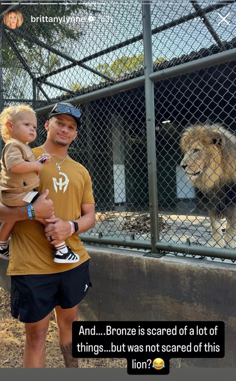 In a photo from the animal filled day shared to her Instagram Story Oct. 10, Patrick held Bronze in his arms while they came face to face with a majestic lion through the enclosure. And to Brittany's surprise, their little one wasn't fazed by the encounter.
