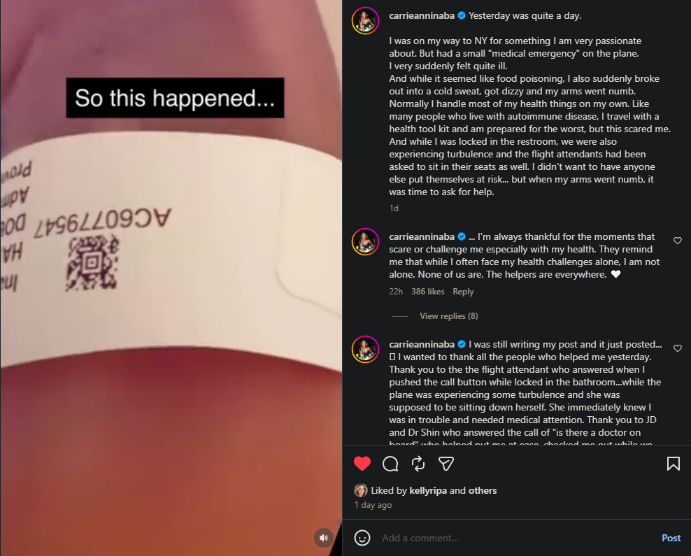 Carrie Ann Inaba was hospitalized following a medical emergency during a flight.
