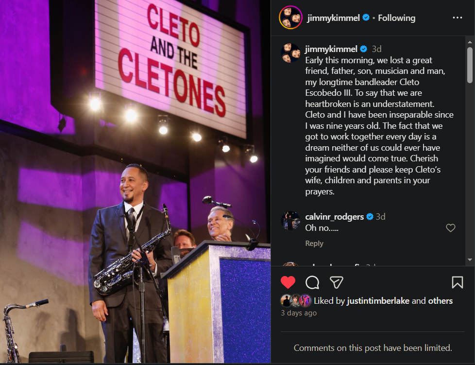 “Early this morning, we lost a great friend, father, son, musician and man, my longtime bandleader Cleto Escobedo III,” at that moment, Jimmy posted on Instagram. “To say that we are heartbroken is an understatement.”