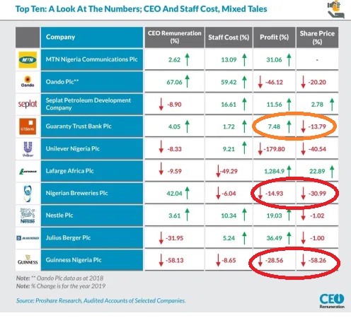 Some of the largest companies in Nigeria as at Dec 31 2019. The breweries did not have a good year. Unilever seems extremely challenged as pockets of small makers continue to break the moat for that castle. Check our GTBank - profit up, share price down: a paradox continues. But the luckiest dude is the Oando man - 67% increased CEO compensation for generating 46% lesser profit. But the winner is Lafarge and that explains why Dangote went for the star CEO.