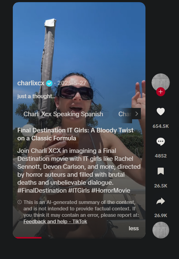 Charli, who married The 1975 drummer George Daniel in July, really mentioned that she posted a horror movie concept on TikTok in May, elaborating on what she called a "it-girl Final Destination."
