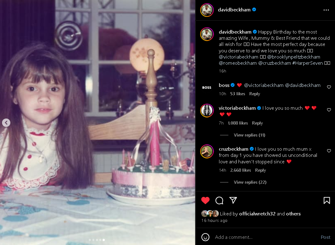 Their son Cruz added a sweet comment to the post, writing, "I love you so much mum x from day 1 you have showed us unconditional love and haven’t stopped since." Which Victoria also reshared the post to her own Instagram Story, writing back, "I love you so much."
