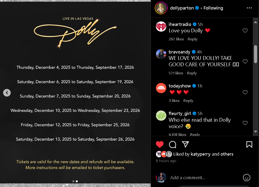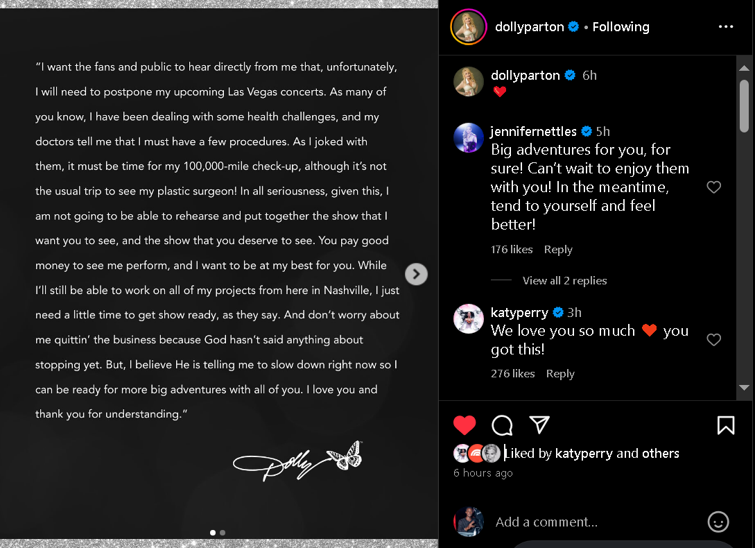 "In all seriousness, given this, I am not going to be able to rehearse and put together the show that I want you to see, and the show that you deserve to see," Parton went on. "You pay good money to see me perform, and I want to be at my best for you. While I'll still be able to work on all of my projects from here in Nashville, I just need a little time to get show ready, as they say."