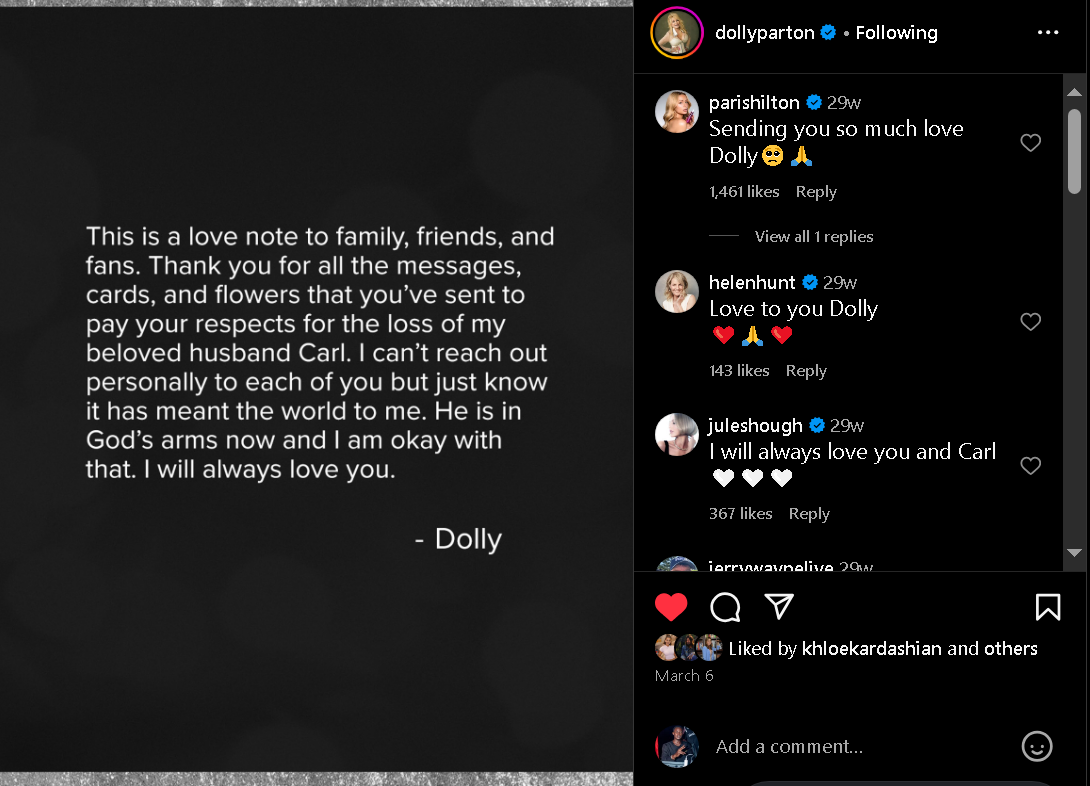 “Thank you for all the messages, cards and flowers that you’ve sent to pay your respects for the loss of my beloved husband Carl," at that time, she posted on social media. “He is in God’s arms now and I am okay with that. I will always love you."