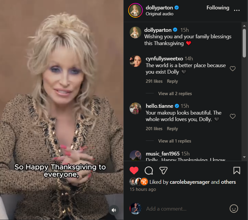 “Well, hey, it's Dolly here,” in a video uploaded to Instagram on November 27, she stated, “and I want to wish all of you and your family blessings this Thanksgiving.”
