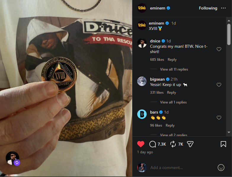 To commemorate the significant occasion, Eminem (born Marshall Bruce Mathers III) posted a zoomed-in image of himself held up a coin while sporting a graphic T-shirt on Instagram on April 20.
