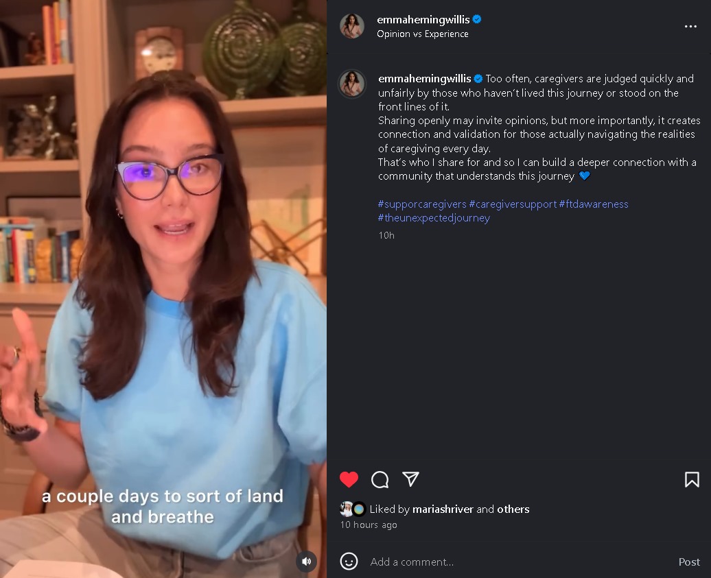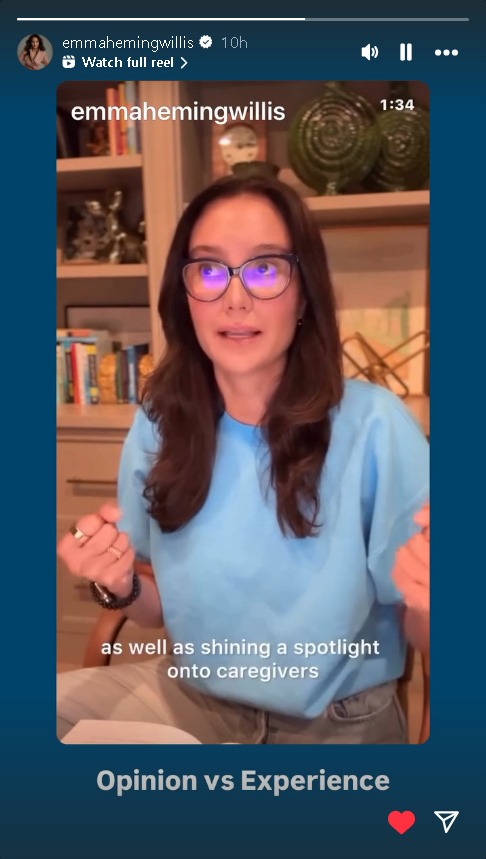 Emma Heming, the wife of Bruce Willis, discusses "judgment" after disclosing that they live in different houses tagged "Opinion vs Experience."