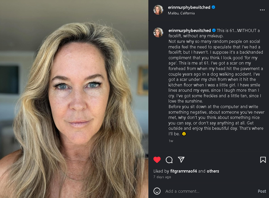 “This is 61…WITHOUT a facelift, without any makeup,” on October 20, Erin posted a selfie to Instagram. “Not sure why so many random people on social media feel the need to speculate that I’ve had a facelift; but I haven’t.”