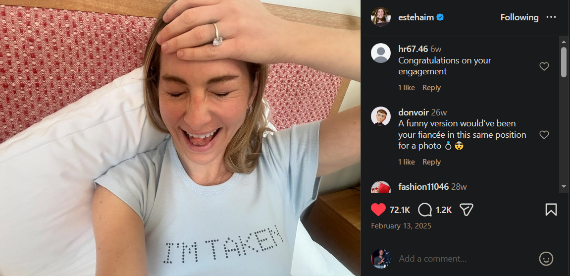 When Este revealed her engagement in a photo with her square-stoned ring in February, she finally displayed the finished piece.