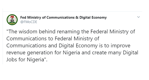 "The wisdom behind renaming the Federal Ministry of Communications to Federal Ministry of Communications and Digital Economy is to improve revenue generation for Nigeria and create many Digital Jobs for Nigeria".