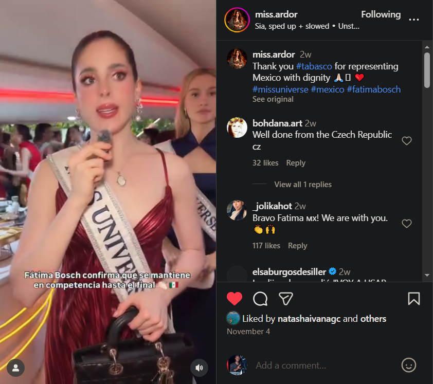 Flowers have been sent to Miss Mexico. On November 21, Fátima Bosch Fernández won the title of Miss Universe. Miss Thailand Praveener Singh, 29, came in second, and Miss Venezuela Stephany Adriana Abasali Nasser, 25, came in third.