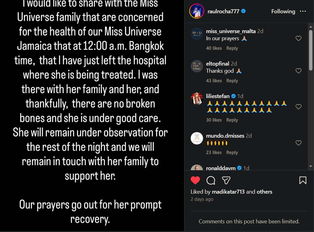 Raúl Rocha, a co-owner of the pageant, gave a positive report on the Miss Jamaica contestant's health after the startling incident.