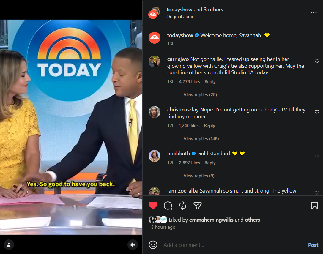 Savannah previously conducted an interview with former Today coworker Hoda Kotb, who also filled in during Savannah's absence, in which she described her experience of the ordeal, even though this is the first time she has returned to the morning show for a live broadcast since her mother's suspected kidnapping.